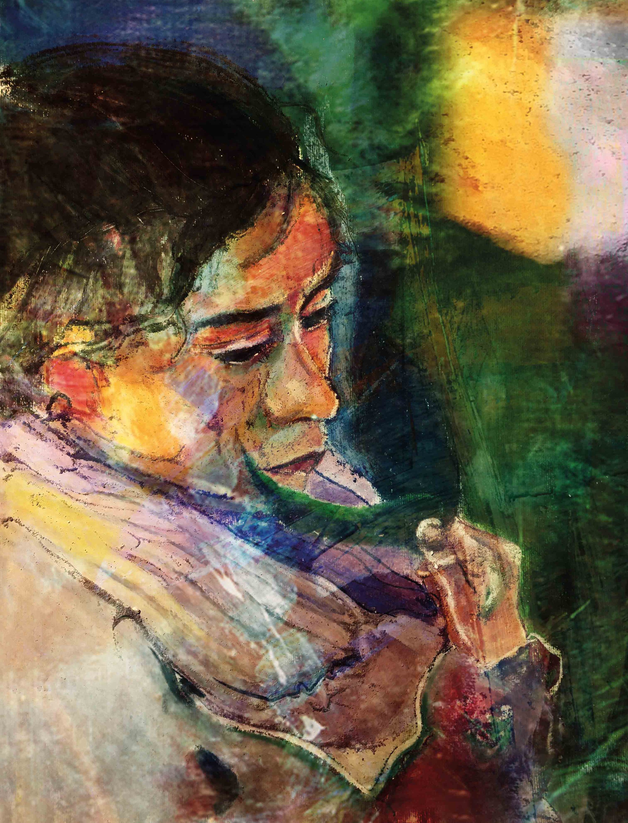 Ich erinnere mich gut an den Moment, in dem die Aufnahme, die als Grundlage dieses Kunstwerkes dient, entstand. Auf einem Spaziergang in der Abendsonne versank sie, zwei Blätter in der Hand haltend, in ihre eigene Welt.